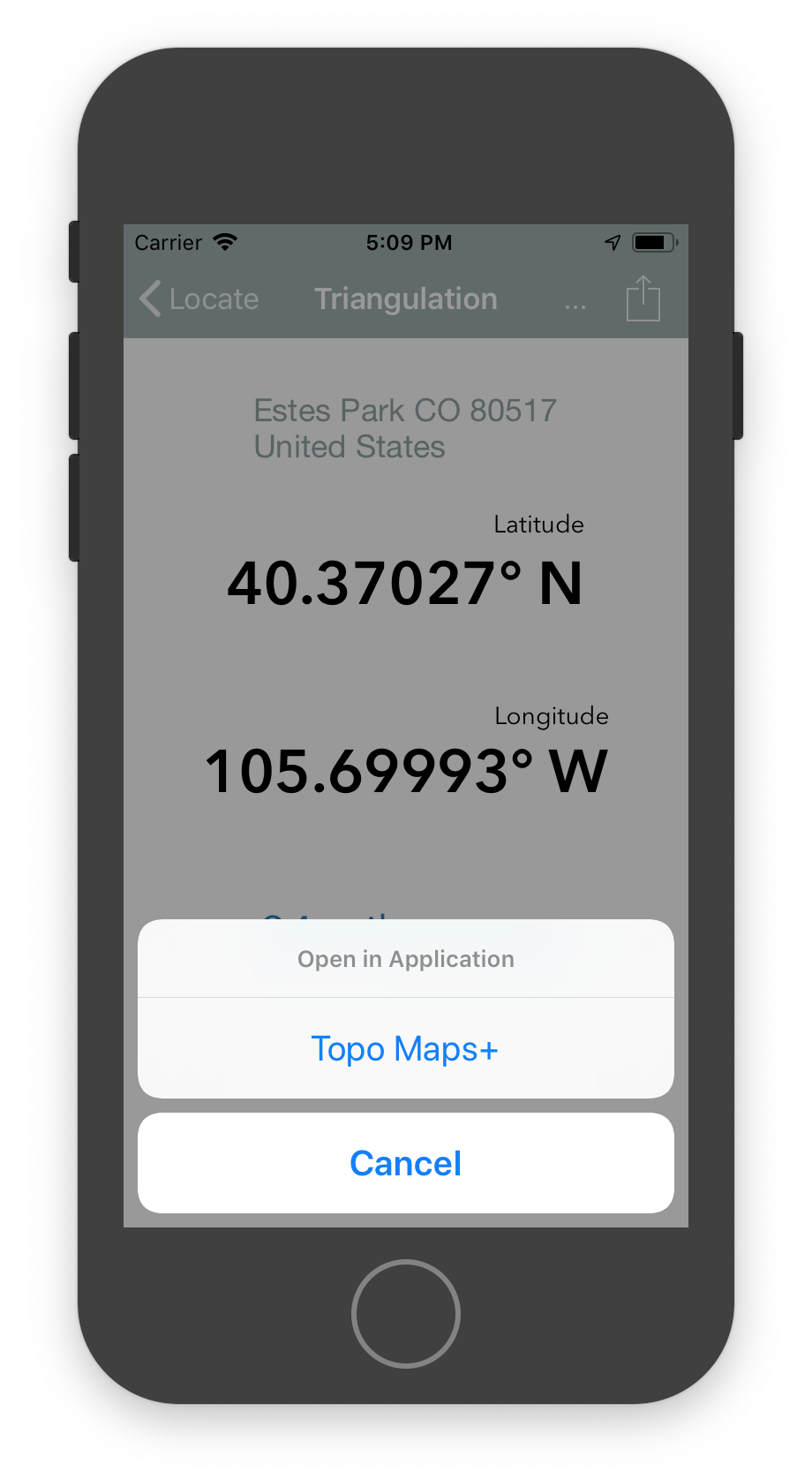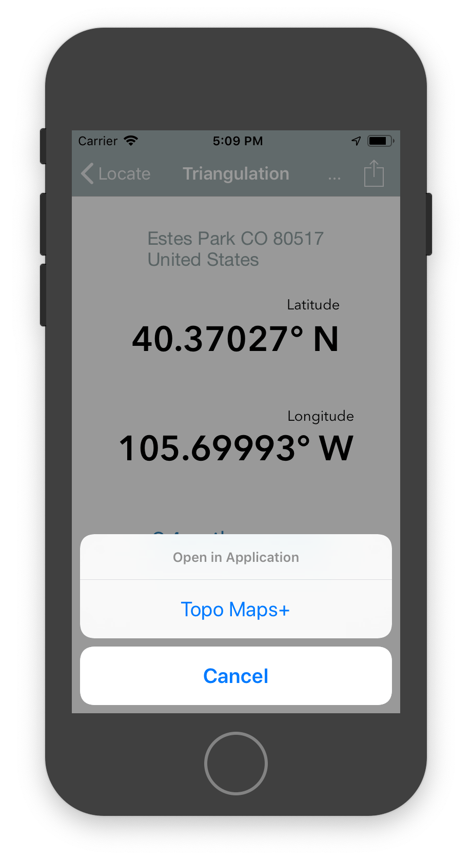 Field Triangulate for iOS version 1.1.2 will allow a triangulation (latitude / longitude) to be sent to Topo Maps+ (even when fully offline) in order for Topo Maps+ to display the map for that location. Topo Maps+ will use the current map, and current zoom to present that location.