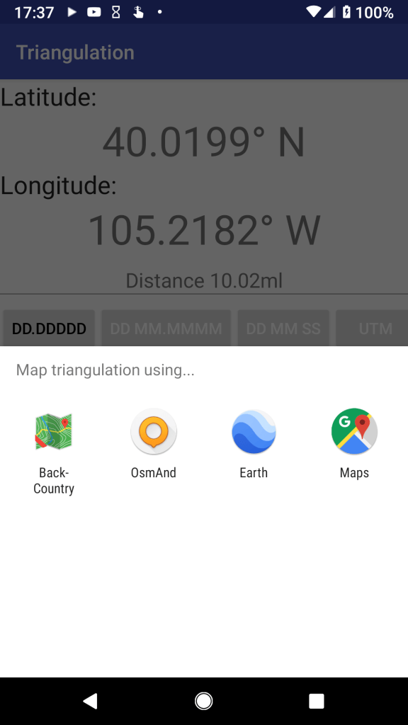 Let me know what application you use for offline-capable topographic maps on Android devices, and I’ll look to integrating Field Triangulate to that on Android.