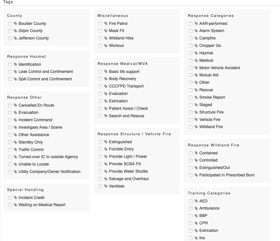 Our two main groups are “Response Categories” and “Training Categories” and for incidents we tag the main aspect of the call from the former. We then provide additional details through the other “Response *” groups of tags.